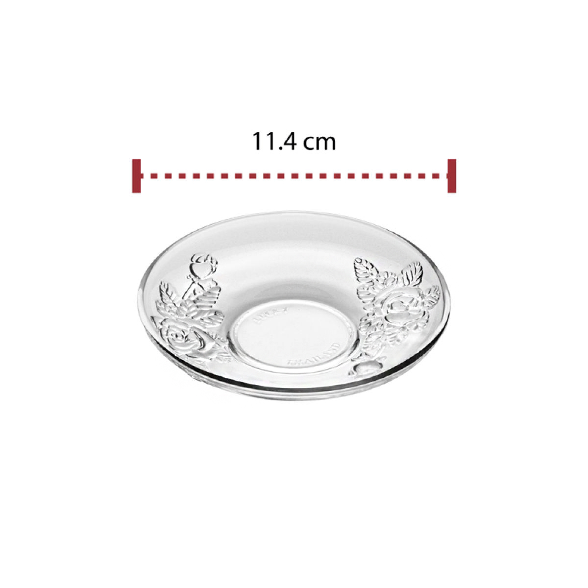 จานแก้ว จานรอง LG712504 ใช้เป็น จานรองแก้ว สำหรับเสิร์ฟเครื่องดื่มประเภท ชา กาแฟ ขนาดประมาณ 11.4 cm (~4.5 นิ้ว) เหมาะใช้คู่กับแก้วลายกุหลาบ LG-312503